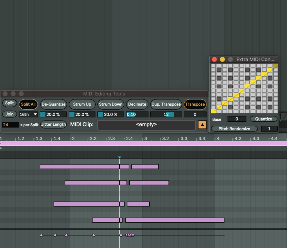 Finally Ableton has good midi editing capabilities thanks to MZ MIDI Edit! Do things like split notes, join notes, de-quantize, strum and more! Most parameters are key mappable as well.